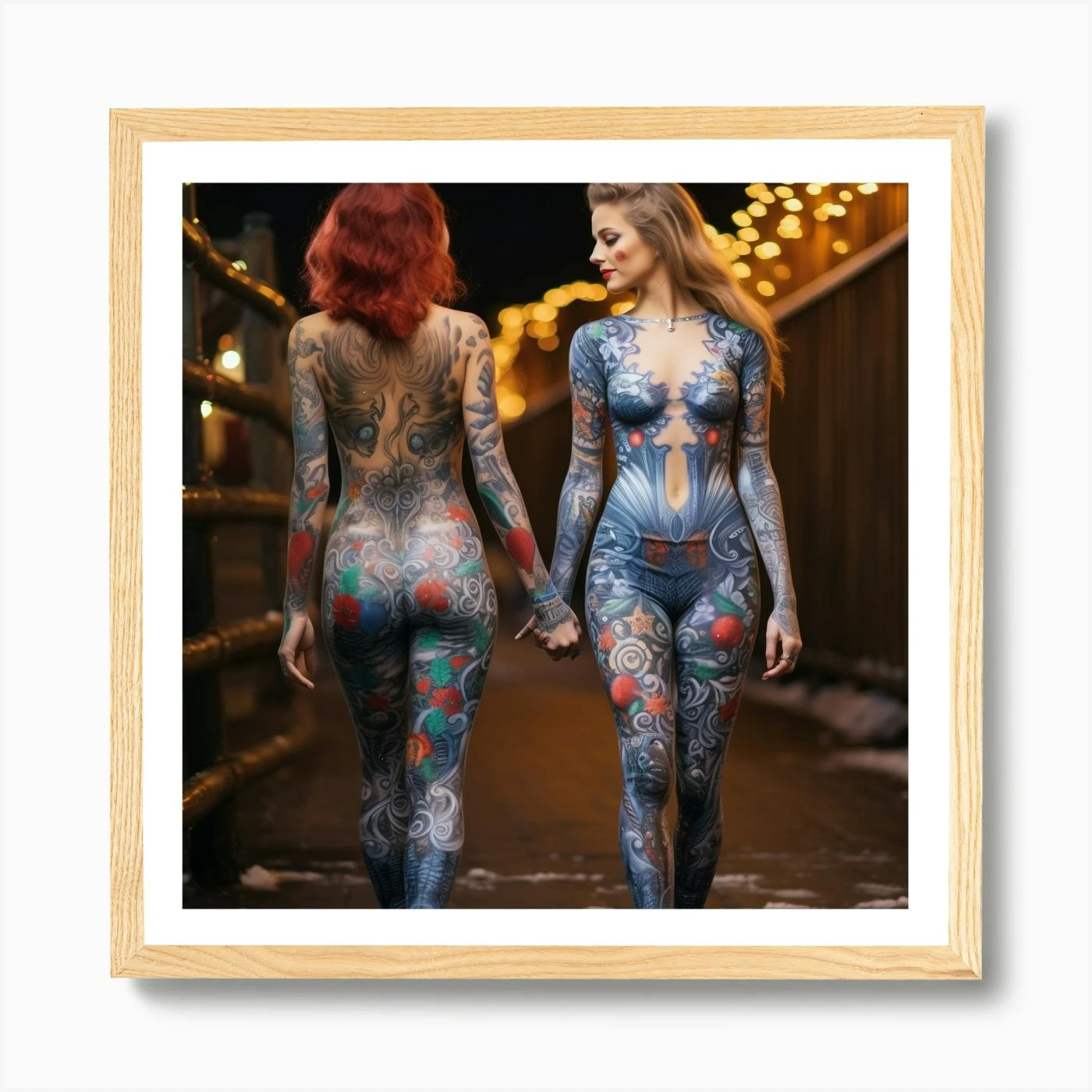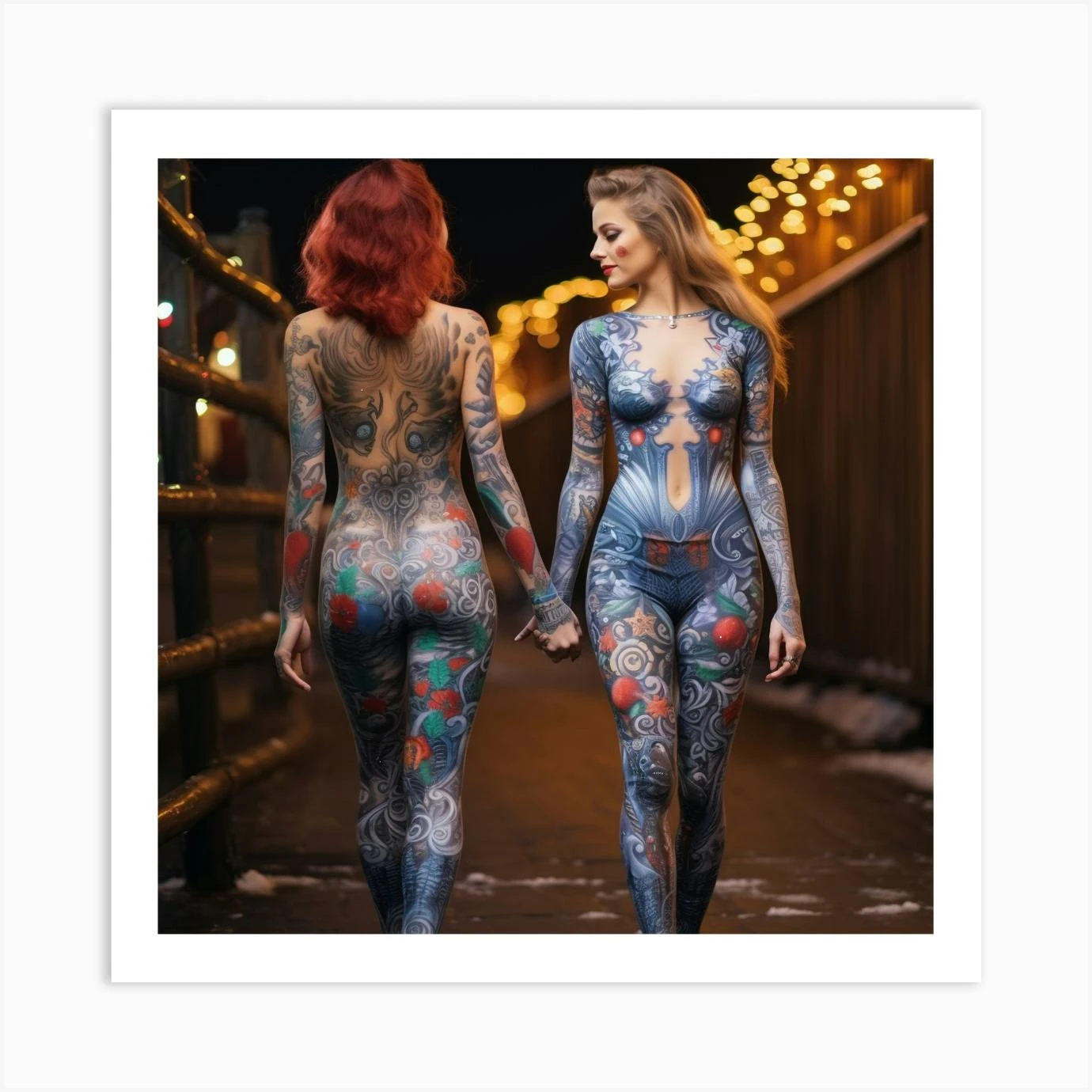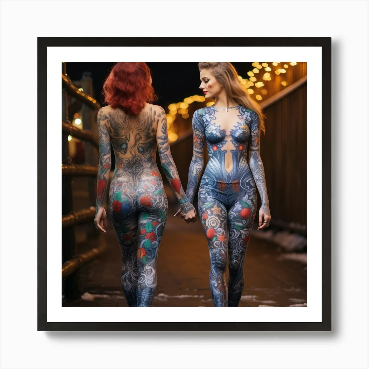 Two Attractive Women With Tatoos Wearing Body Painting Go For A Walk In The Christmas Eve 2 Art Print